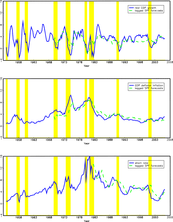 Figure 1 plots the 3-month nominal short rate, the final-vintage data on annual real GDP growth and annual GDP deflator inflation, together with the corresponding SPF forecasts four quarters ago, for the full sample of 1965Q4 to 2006Q2. Appendix A provides details on the data.