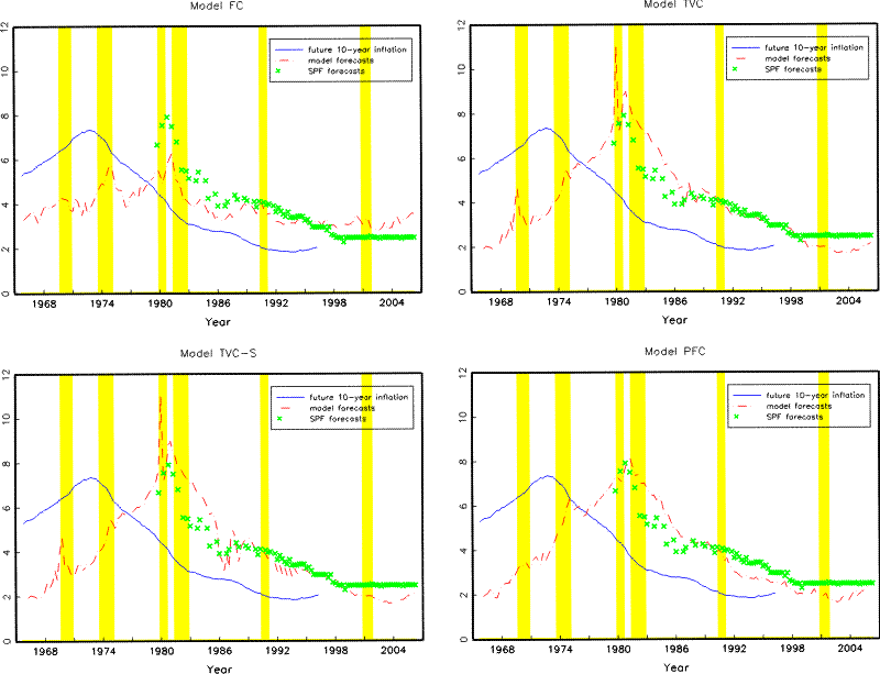 | Horizon | Model FC: 1-yr | Model FC: 2-yr | Model FC: 5-yr | Model FC: 10-yr | Model TVC: 1-yr | Model TVC: 2-yr | Model TVC: 5-yr | Model TVC: 10-yr | Model TVC-S: 1-yr | Model TVC-S: 2-yr | Model TVC-S: 5-yr | Model TVC-S: 10-yr | SPF: 10-yr |