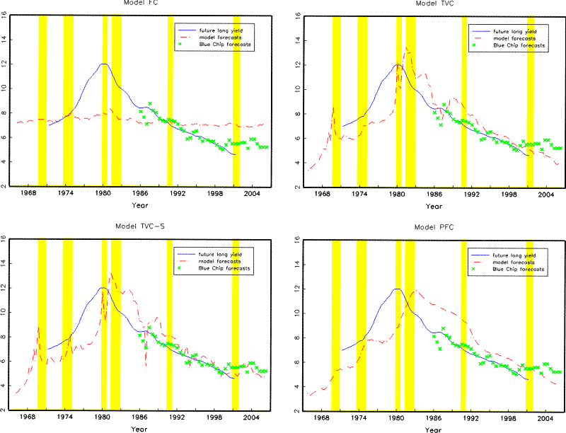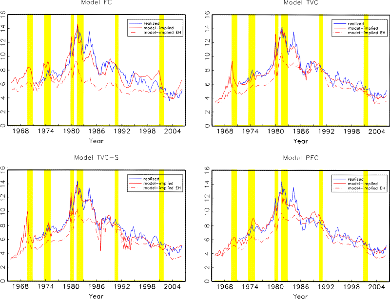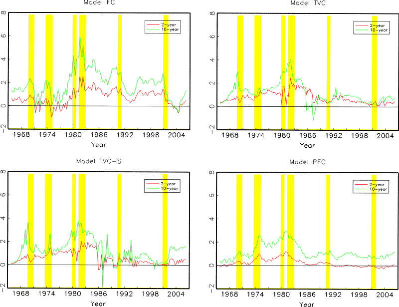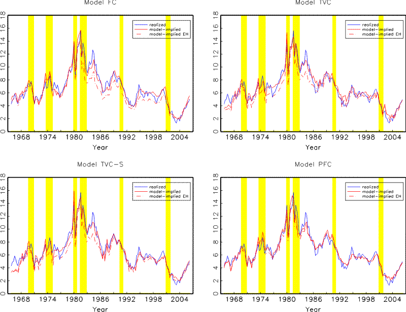For illustration purposes, we also estimate three alternative models. The first alternative model is motivated by Kozicki and Tinsley (2001b), who show that allowing time variations in the perceived inflation target is crucial for explaining the movement in the long end of the yield curve. To evaluate the relative contribution of time variations in the drifts versus in the rest of the parameters, we estimate an alternative model (Model PFC) where the drift terms, but not the slope or the volatility coefficients, vary over time. More specifically, we first estimate the time-varying drifts as the discounted weighted averages based on the last ten years of data, the same way as in Model TVC, and then estimate the slope and volatility coefficients using the demean data over the full sample. The second alternative model (Model TVC-L) is a variant of Model TVC, where we allow an additional latent factor to drive the term structure, as outlined in Section 3.2. To compare the role of such an additional latent factor when perceptions about macroeconomic dynamics are allowed to evolve over time versus the alternative fixed-coefficient assumption, we compare this model with Model FC-L, which adds a latent factor to Model FC.