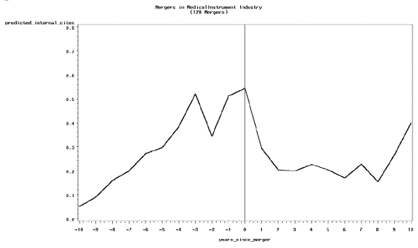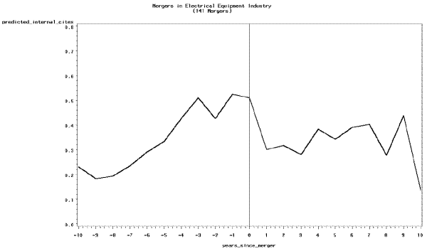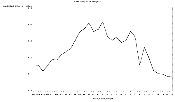 It appears that internal citations tend to increase in the years leading up to the merger, and begin to fall in the years following the merger. Looking at the plot, it is easy to imagine that the number of internal citations averaged across all years after the merger might be either greater or less than the number of internal citations averaged across all years before the merger, depending on the method of estimation. The year-to-year pattern is more revealing. The increase in internal citations in the years leading up the merger suggests an innovation race; the fall in internal citations in the years following the merger suggests a reduction in competition.