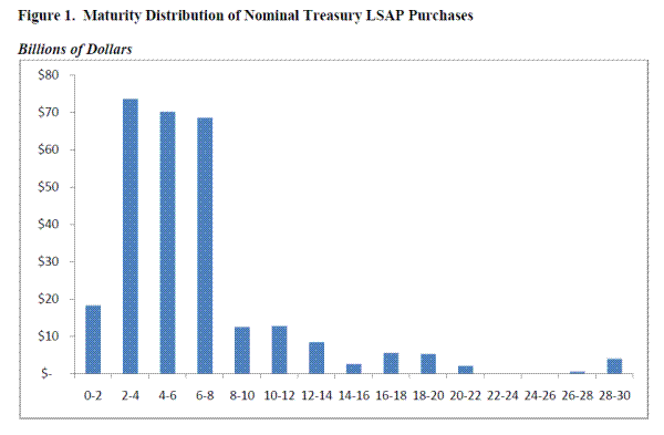 Overall, purchases of nominal securities under the Treasury LSAP program included 160 unique CUSIPs, spanning remaining maturities of about two to thirty years. $300 billion represented about 3 percent of the total stock of outstanding Treasury debt and about 8 percent of the outstanding coupon securities as of the time of the announcement. Table 1 and Figure 1 provide some additional statistics summarizing the characteristics of purchased securities. Most purchases were concentrated in the 2- to 7-year sectors, although, as a percentage of total outstanding Treasuries within each sector, purchases across maturities were less concentrated. Coupon rates and vintages of securities purchased were roughly similar to the averages of all outstanding Treasuries. The average maturity of securities bought was a bit longer than average, but the yields on purchased securities were notably higher than average--seemingly by too great a margin to be accounted for solely by their slightly longer maturities, especially given that a relatively high fraction (approximately 30 percent) of purchases were on-the-run issues, which generally have lower yields. This suggests that, consistent with contemporary commentary, the Desk deliberately purchased securities that were underpriced, a claim that we will illustrate more formally below.