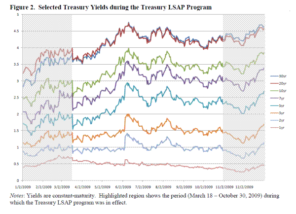 There was particular cause for skepticism regarding the program to purchase Treasury securities. The market for U.S. government debt is among the largest and most liquid in the world, and it was not obvious that even such a sizeable intervention--the $300 billion purchased by the Fed constituted about 8 percent of the market at the time--would have significant effects, given the array of other securities that serve as potential substitutes for Treasuries. Indeed, while the MBS and agency-debt LSAP programs were quickly judged successful, with conventional mortgage rates dropping about 1 percentage point after the announcement of these programs and remaining in the range of 5 percent for the duration of the crisis, the effects of the Treasury program were far from obvious. Treasury yields fell notably when the program was announced on March 18, 2009, but they retraced those declines in subsequent weeks. Some observers even speculated that the program could perversely serve to increase yields if the accompanying rise in reserve balances were seen as inflationary or if the Fed were viewed as accommodating fiscal expansion by "monetizing the debt."1