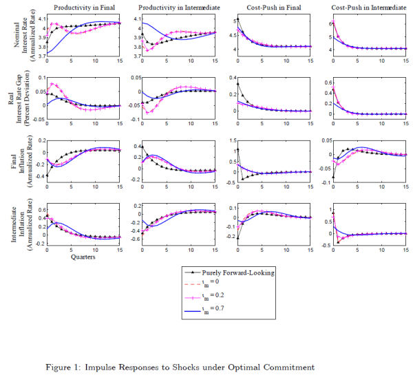 How do these additional complications arising from inflation persistence affect optimal policy under commitment? Figure 1 presents the optimal commitment responses to positive shocks under different combinations of sectoral inflation persistence. The standard forward-looking case is obtained by