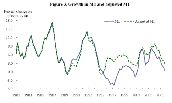A different means through which financial innovation affects M1 behavior has proved to be much more significant in practice. The innovation that banks have favored has not made M1 deposits more attractive vehicles, but rather made it easier to shift between M1 deposits and interest-bearing deposits that are outside M1 but included in M2. "Sweeps" programs allow routine transfers, at the banks' initiative, between M1 deposits and non-M1 deposits. An embryonic version of this arrangement developed during the 1970s in the form of automatic transfer services (ATS) (see Hafer, 1980), but extensive adoption of retail sweep deposit programs on the part of banks did not take effect until January 1994 (Anderson, 2003). The arrangement is attractive to depositors because of the better returns on non-M1 M2 deposits, and appeals to banks as a means of avoiding the more onerous reserve requirement on M1 deposits. The resulting portfolio behavior is believed to have created variations in M1 that have little macroeconomic meaning, with Anderson (2003, p. 1) arguing, "Retail-deposit sweep programs are only accounting changes: they do not affect the amounts of transaction deposits that banks' customers perceive themselves to own." (Italics in original.) A series of studies (including Jones, Dutkosky, and Elger, 2005, and Cynamon, Dutkowsky, and Jones, 2006; and Dutkowsky, Cynamon, and Jones, 2006) has attempted to correct the U.S. monetary aggregates for the effect of the sweep program. Figure 3 plots growth in M1 against growth in an adjusted M1 series. The deposits component of this adjusted series, following Ireland (2009), is based on replacing M1 deposits after 1993 with the Cynamon-Dutkowsky-Jones M1 deposit series that corrects for sweeps. In addition, the adjusted series used in Figure 3 subtracts Federal Reserve Board estimates (available from 1964 onward) of U.S. currency held abroad, as reported in the flow of funds. We see from Figure 3 that these adjustments, on balance, lead to a more moderate decline in M1 growth during the late 1990s.