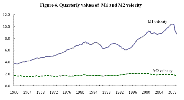 Figure 4 plots the velocities of M1 and M2. As is well known, the combination prevailing before the early 1980s was of an upward-trending M1 velocity and a stationary M2 velocity. As is also well known, M1 velocity underwent a major break in trend after 1981. (The apparent resumption of an