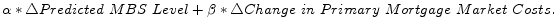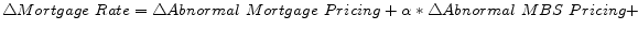 We use a simple decomposition of the mortgage rate to summarize the effects of the Federal Reserve's mortgage purchase program. The changes in the mortgage rate can be broken into the changes in (1) the abnormal mortgage pricing (i.e., the change in the difference between the expected and actual mortgage rate), (2) the abnormal MBS pricing (i.e., the change in the difference between the expected and actual MBS yield), (3) the predicted MBS yields, and (4) the primary mortgage market costs. In other words, if:
