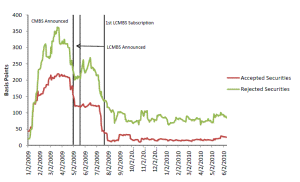 Legacy CMBS were accepted as collateral for TALF loans in nine subscriptions, one per month, between July 2009 and March 2010. Some broad parameters that established the types of eligible CMBS were made public to investors. For example, all legacy CMBS posted as collateral had to be senior in payment priority to all other interests in the underlying pool of commercial mortgages and had to have at least two triple-A ratings (the top rating for the agency) and no ratings below triple-A. In addition, all securities pledged as collateral for TALF loans were further scrutinized by the Federal Reserve Bank of New York and could be rejected as loan collateral in the event that it was determined that the security posed unacceptable risk. Over the nine subscriptions that accepted legacy CMBS as collateral, 267 distinct securities were accepted as collateral and 44 were rejected. Importantly for our analysis, the acceptance and rejection decisions were announced on the Federal Reserve Bank of New York's website about a week after each subscription; these announcements are the dates used in our security-level event study analysis.