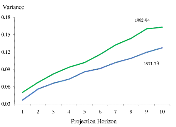 = 1 - 10) for two periods, 1971-1973 and 1992-1994. We see that the gap between the two curves is much wider at farther horizons than at nearer horizons. This "fanning-out" pattern, holding the level of shock persistence constant, suggests that the increase in