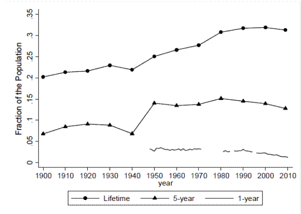 Note. Lifetime and 5-year migration rates are from the denennial Census 1900-2000 and from the ACS for 2009. Five-year migration rates are estimated from microdata on the fraction of households with a 4- or 5-year old residing outside of their birth state (Rosenbloom and Sundstrom 2004). Annual migration rates are calculated from Current Population Survey microdata.