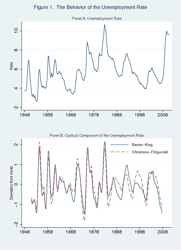 I consider two types of band-pass filters, the BK symmetric band pass filter that uses a fixed window (e.g. 25 quarters) and constant weighting to filter the data, and the CF asymmetric random walk band-pass filter which uses the entire sample and varying weights. The BK filter can accommodate I(2) processes, while the CF filter, as the name implies, assumes the process is a random walk.3 The two filters give very similar estimates.4 I also consider definitions of cyclical frequencies that are somewhat lower than typical. More specifically, the literature typically considers periods from 6 quarters to 32 quarters as cyclical. I use this definition, but I also examine results for filters that define cyclical as having a period from 6 quarters to 40 quarters. Under this definition, lower-than-cyclical frequency, or trend, movements in unemployment are smoother and may correspond more closely to some observers' notions of the distinction between cyclical and secular.