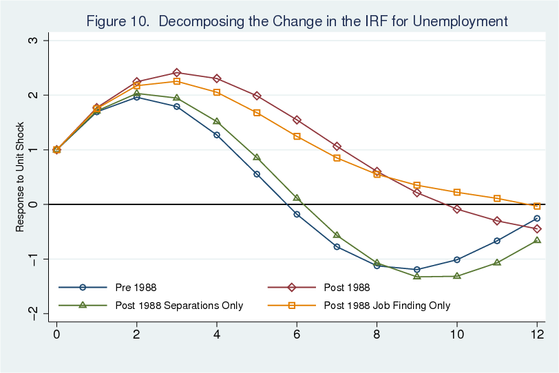 To see if this is the case, I decompose the change in the impulse response function for unemployment (from pre to post 1988) into a component due to the break in the behavior of separations and a component due to the break in the behavior of job finding. Note that one can express the unemployment rate as the infinite moving average of innovations to the separations contribution plus the infinite moving average of innovations to the job finding contribution.11