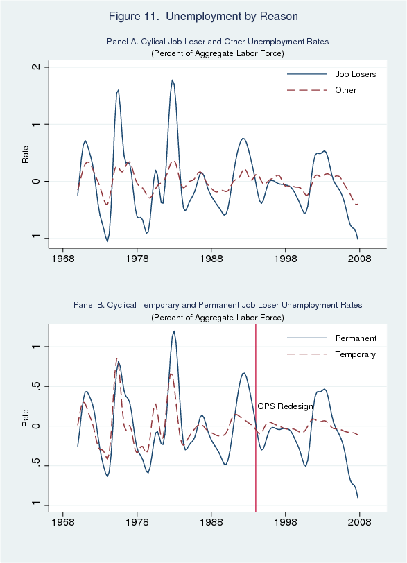 I first distinguish between job loss and other reasons for being unemployed. There are likely significant differences between these two types of unemployed workers. First, as their classification implies, job losers' change in labor force status was likely due to a change in their firms' relative profitability or efficiency. Other types of unemployed individuals were either out of the labor force or quit their previous jobs, and thus their change in status may be more related to changes in household circumstances. Second, job losers are more attached to the labor force than other unemployed individuals: Matched CPS data show that hazards for exiting the labor force are much lower for job losers than for other types of unemployed workers. As a result, the behavior of job losers is more likely to be affected by changes in the relative advantages of employment and unemployment, while the behavior of other types of unemployment is more likely to be affected by changes in the relative advantages of being in or out of the labor force. Nevertheless, both types of unemployed are likely affected by cyclical changes in labor demand.