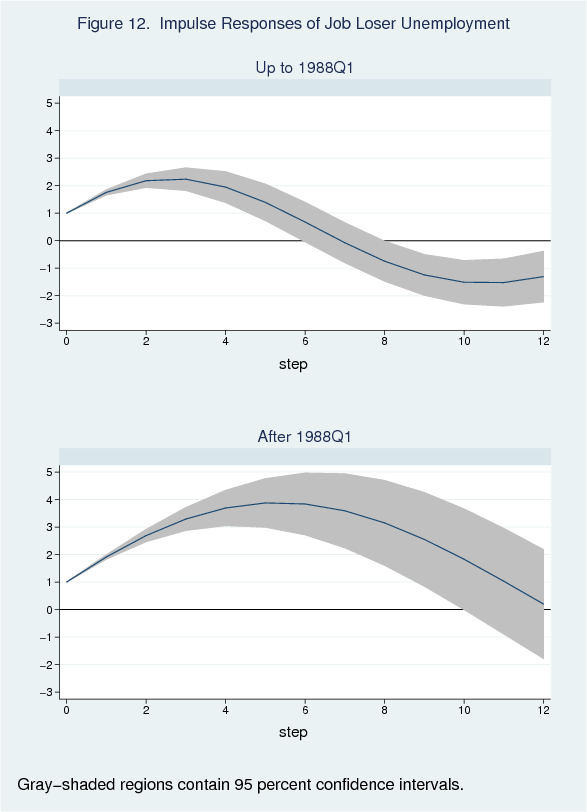 The top panel in figure 11 graphs cyclical components of job loser and other unemployment as a percent of the labor force. Although both series are procyclical, job loser unemployment shows larger cyclical swings and appears to follow the cyclical pattern of the aggregate unemployment rate more closely. Table 9 shows test statistics for breaks in parameters given an exogenous break date of 1988Q1. For job losers, there is strong evidence of a break in the first, second and both lags. In contrast, there is very little evidence of a break in the behavior of other unemployment. Pre and post break impulse responses, shown in Figures 12 and 13, reveal that only job loser unemployment became significantly more persistent after 1988Q1.