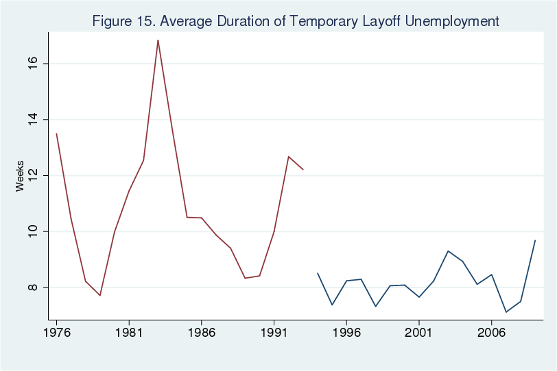 Indeed, from figure 15-which shows a time series of the average duration of uncompleted spells of temporary layoff unemployment-it's quite apparent that there is a break in this series in January 1994, with average durations beginning in 1994 much lower than previous durations.13 Thus, data on the duration of uncompleted spells of temporary layoff unemployment strongly suggest that the break in classification had a noticeable effect on the types of individuals classified on permanent and temporary layoff.