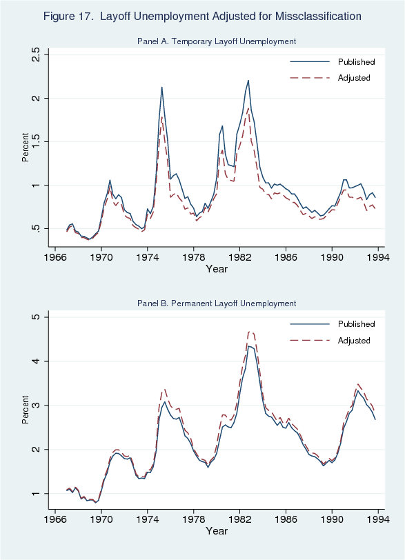 My estimates of the share of temporary job losers that were misclassified are shown in figure 16. The pattern is strongly countercyclical: Misclassification increases in when the unemployment rate rises. To adjust for misclassification prior to 1976, when CPS micro data are not available, I use the relationship between misclassification and the unemployment rate from 1976 to 1993 to adjust the pre-1976 data.