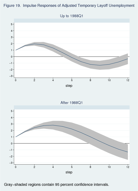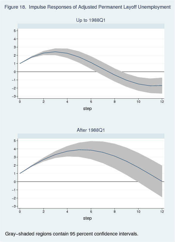 Table 11 shows F statistics and pre and post break coefficient estimates for the different types of parameter breaks. The adjusted data also strongly suggest significant breaks in the behavior of both components. Figures 18 and 19, which plot impulse responses before and after 1988, show that both components became more persistent after 1988, though the change is more noticeable for permanent layoff unemployment.
