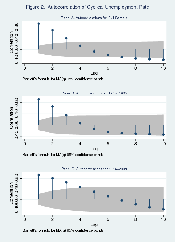 An alternative perspective on these points comes from autocorrelation functions of cyclical movements in unemployment. Figure 2 shows that cyclical unemployment rate movements are positively correlated for longer spans of time after the mid 1980s than before. The change in the shape of the
