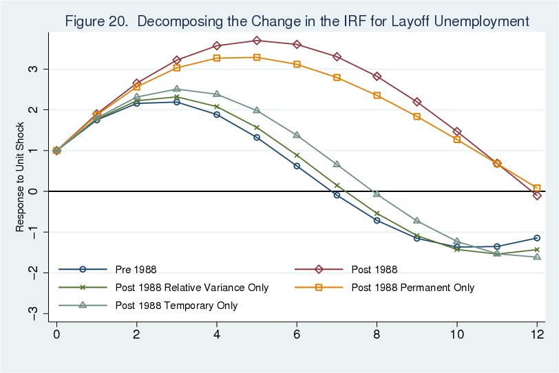 Again, I decompose the change in the IR function for unemployment into layoff and other components using an equation analogous to (4). Figure 14 shows that the change in the impulse response function from pre 1988, the line with the circles, to post 1988, the line with the diamonds, is predominantly due to changes in the impulse response function for layoff unemployment, the line with the squares. The change due to a change in relative variances, the line with the Xs, and to the change in the impulse response function of other unemployment, the line with the triangles, is relatively small.