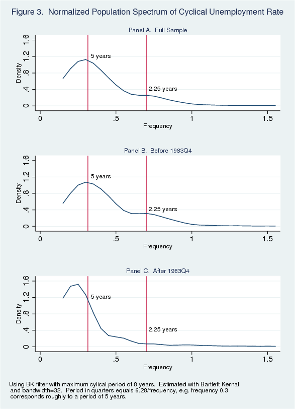autocorrelation function suggests that after the mid 1980s cyclical fluctuations in unemployment lacked a higher frequency component present in earlier data. To illustrate this more clearly, figure 3 shows an estimated normalized population spectrum for cyclical movements in the seasonally adjusted