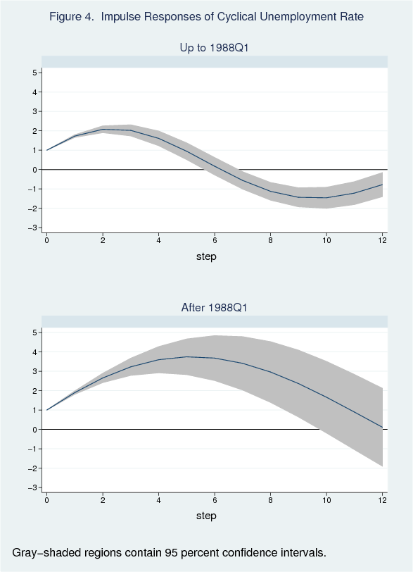 Figure 4 shows the impulse responses implied by the pre and post break coefficients using the BK 8 year filter (assuming a break in both coefficients). In the pre-break period, the effect of a shock to the unemployment rate remains positive for about 6 quarters and is statistically significant for 5 quarters. In the post break period, the effect of a shock remains positive for 12 quarters and is statistically significant for 9 quarters.8 Table 3 shows the difference in the pre and post break IR functions along with bootstrapped 95 percent confidence intervals for each type of filter. For all specifications, the difference in pre and post IR functions is large and significantly different from 0 through step 11.