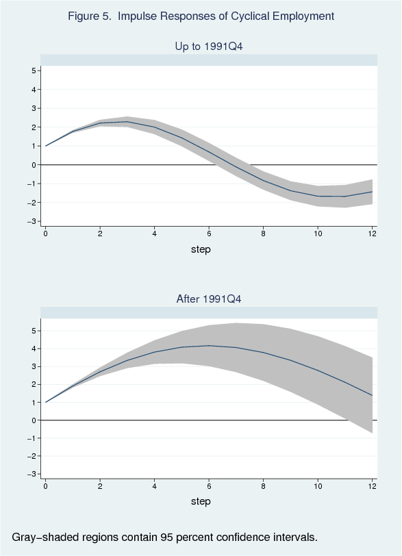 Table 4 shows changes in coefficients assuming an exogenous break date of 1983Q4, and Sup Wald tests for breaks in the various combinations parameters are shown in table 5. As with unemployment, all breaks are highly significant. The second column of table 5 shows that estimated primary break dates for employment are somewhat later than those for unemployment, occurring in the early to mid 1990s, as opposed to the mid to late 1980s. The panels of figure 5 plot implied impulse responses before and after the 1991Q4, the estimated break date when using the BK filter with a maximum period of 8 years. It shows clearly that cyclical movements in employment have become more persistent. Table 6 shows that the difference between pre and post break impulse responses remains positive and statistically significant through step 10 for all specifications. For some specifications and parameter breaks, impulse responses are positive and statistically significant through step 12. Similar to unemployment, there also appear to be secondary breaks. Again these secondary breaks occur in the early to mid 1970s and in the early 2000s.