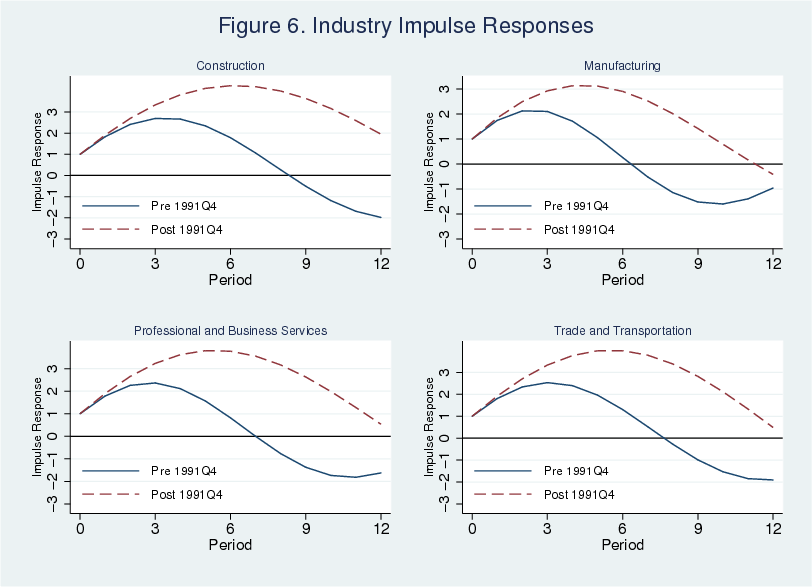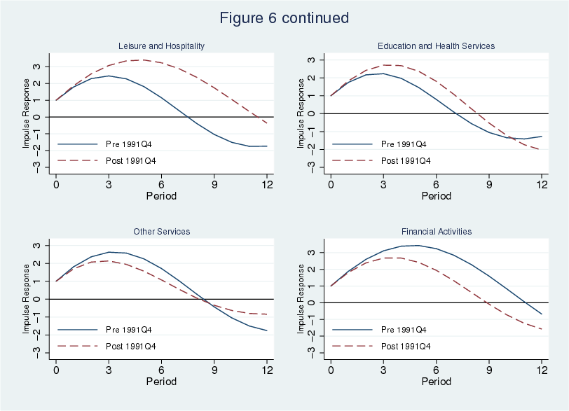 First, using employment data from the CES, I examine whether the break in persistence has been concentrated by industry. The sample period is again 1951 to 2007. I estimate separate regressions for the following 8 1 digit industries: construction, manufacturing, professional and business services, trade and transportation, education and health services, leisure and hospitality, financial activities, and other services. The statistical significance of breaks in various combinations of parameters, given an exogenous break date of 1991Q4 (the date estimated using private nonfarm employment), are shown in table 7. Five of the industries-construction, manufacturing, trade and transportation, professional business services, and leisure and hospitality-have breaks significant at the 1 percent level. The implied impulse responses before and after 1991Q4 for each industry are shown in figure 6. For the 5 industries with significant breaks, cyclical movements in employment have become more persistent. For industries without significant breaks, persistence has either changed little (other services and education and health services) or diminished (financial activities). These industries account for an average of only about 20 percent of private nonfarm payroll employment over this period. In sum, the change in persistence appears to be quite broad based, affecting industries accounting for a large majority of private nonfarm employment.