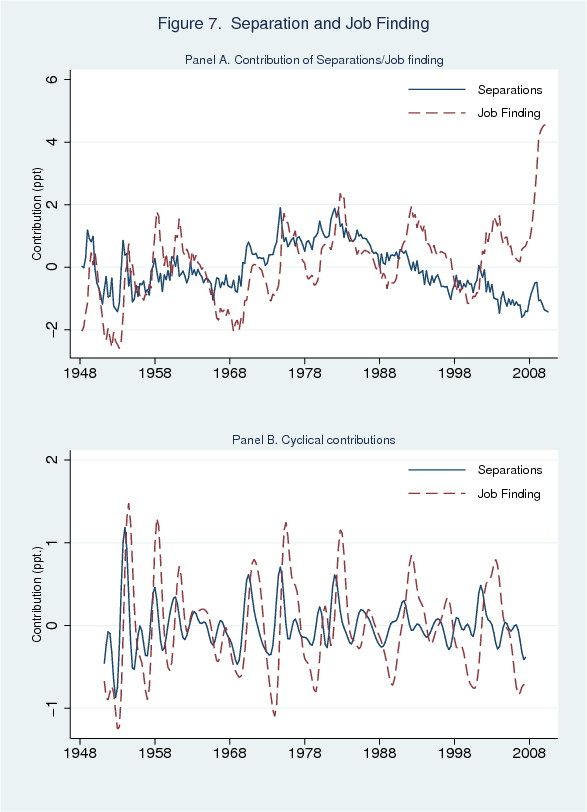 Next, I decompose unemployment into separation and job-finding rates. While there is strong evidence of a change in the cyclical behavior of job finding occurring at the same time as the change in unemployment behavior, there is little evidence of a change in the persistence of separations. As a result, a decomposition of the impulse response function for aggregate unemployment shows that almost all of the increase in unemployment persistence owes to an increase in the persistence of job finding rates.