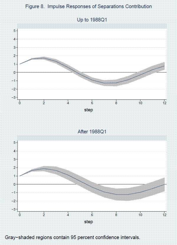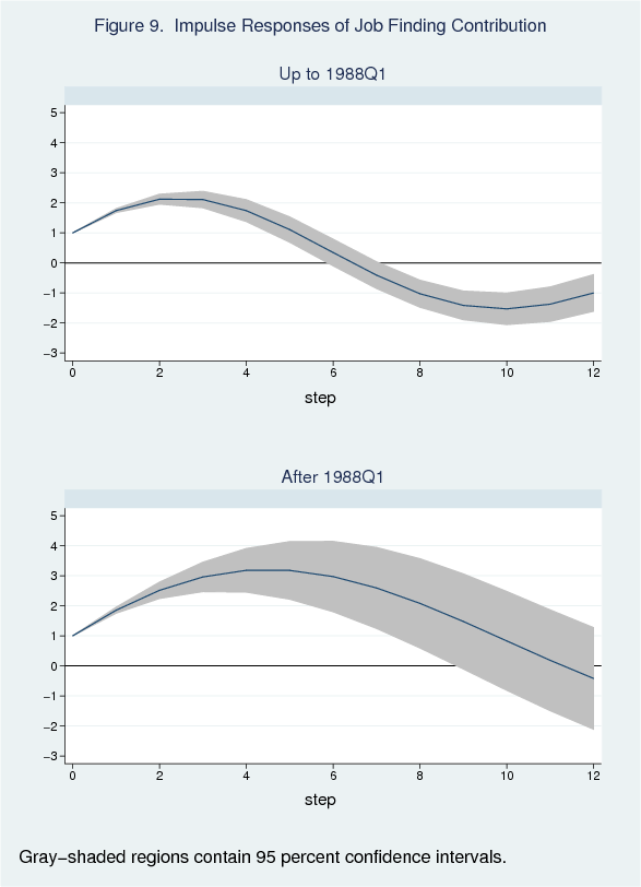 Figures 8 and 9, which plot impulse response functions before and after 1988Q1, show that job finding became considerably more persistent after 1988 and separations only slightly more persistent. This, together with the impression conveyed by figure 7 that job finding accounts for the larger share of the cyclical volatility in unemployment, suggests that changes in the behavior of job finding have likely contributed more to the greater persistence in the aggregate unemployment rate than separations.
