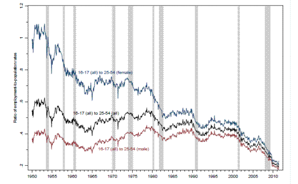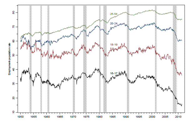 Since the start of the most recent recession, the employment-population rate for high school-age youth (16 and 17 year olds) has fallen from around 23 percent to around 15 percent, and is now at its lowest level since the Bureau of Labor Statistics began collecting data (figure 1).2 However, teen employment has been falling at about this rate since the early 2000s. Taking a longer perspective, youth employment rates have been trending down since the early 1980s; during every subsequent recession, the teen employment rate has tumbled and never recovered to its pre-recession level during the ensuing recovery. While employment rates have also fallen for slightly older, but not yet prime-aged adults, the decline is most dramatic for the youngest-which is particularly puzzling since the decline in employment for youth still in high school cannot directly be attributed to increased college enrollment rates. The decline in the teen employment-population rate looks even steeper relative to the employment-population rate for 25-54 year olds (the black line in figure 2). Figure 3 shows that, until recently, most of this decline was due to a drop in labor force participation rather than an increase in unemployment.