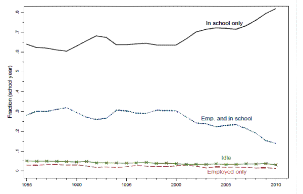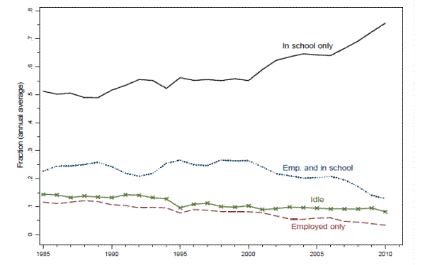 The next set of figures explores how other (very coarse) categories of time use have also changed. Figure 10 plots the (annual average) fraction of teens in each of four mutually exclusive categories: those who are only enrolled, employed and enrolled, only employed, and idle. Since the mid-1990s, there is a gradual decline in the annual fraction not in school (idle, and only employed), and somewhat more recently, a decline in the annual fraction both enrolled and employed. Thus, the fraction only in school has been rising, from about 50 percent in 1985 to over 70 percent in 2010. One important takeaway is that the fraction idle has not been rising despite a decline in employment rates; instead, there is evidently substitution (on an annual average basis) towards schooling.