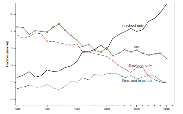Employment rates for high school age youth has fallen nearly 20 percentage points over the last 25 years. Over this period, the share of adults employed in teen jobs has risen due to various reasons, including immigration and polarization in the adult labor market. At the same time, the share of teens involved in educational activities over the summer and enrolled during the school year has risen, likely reflecting the rising returns to college, as well as state education policies (stricter graduation requirements, merit aid scholarships) and possibly also reflecting an endogenous response to increasing labor market competition.