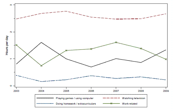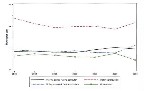 graders who used computers or played video games for three hours per day or more on an average school day increased from 22 percent to 25 percent between 2003 and 2009, though the fraction who watched television for