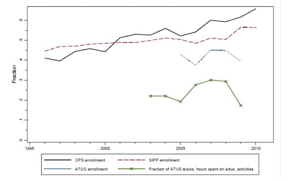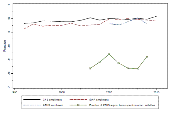 An increasing summer enrollment rate is not a unique feature of CPS data. Figure 15 shows that school-year enrollment rates are fairly similar in CPS, SIPP, and ATUS data (the school enrollment question is similarly phrased in each survey). Figure 16 shows that this is true in the summer as well; the fraction enrolled during summer months rises gradually in both the SIPP and CPS samples, and the estimated fraction is also quite high (above 30 percent) in the ATUS sample. Note that both during the school year and summer months, the fraction of ATUS respondents who report spending any time on education in the survey day is significantly lower. This is to be expected, since someone who is enrolled but absent on the survey day would appear as enrolled based on the enrollment variable but without having spent time on education that day.