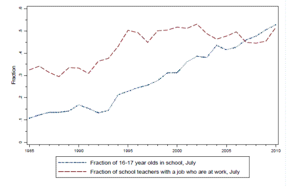One piece of suggestive evidence that reported summer enrollment is related to subsequent college-going is that states with higher college attendance rates for their 19-21 year old population also have higher summer enrollment rates for teens.10 However, if the "college attractiveness" hypothesis explains all of the rise in summer enrollment, then it is unlikely that the number of primary teachers (i.e. elementary teachers) employed in the summer would increase substantially. CPS respondents are asked "what kind of work" they do regardless of current employment status, and, consistent with school teachers taking the summer off, a large fraction of those who report being teachers also report not being at work during the summer months; for instance, in summer 2010 nearly 50 percent of those who report themselves as teachers were not at work. However, the fraction of teachers at work in the summer increased from the early 1990s through the early 2000s, as shown by the red line in figure 17. Further, the shares of primary teachers at work in July show essentially the same pattern as that for secondary teachers (not shown). If the rise in teen summer enrollment is only because of tighter high school graduation requirements (a point which I explore more carefully below), then we might expect to see only the share of secondary teachers rise. Since the trend in July enrollment matches the trend in the share of teachers at work in July (at least through the early 2000s), it seems plausible that some of the increase in enrollment-and decline in employment-may be due to a change in the structure of the school year, i.e. more year-round schooling or a much earlier start date.