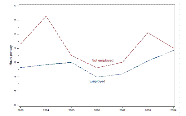 During the summer (weekday), employed males and females spend around 3 hours more per day on work-related activities than the non-employed (3.5 for males, 3.0 hours for females). For the non-employed (both males and females), only around 1 hour of this extra time is spent on educational activities. For males, the rest of the time is spent watching television, playing games or using the computer, or sleeping. For females, the rest is mainly spent watching television, sleeping, or helping with other household tasks.