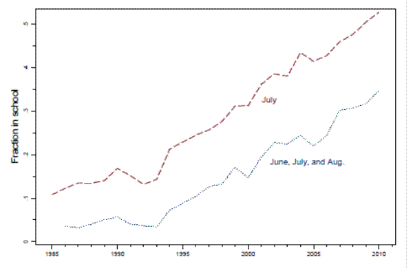 What does the increase in summer school-going represent? One possibility is that teens now are more likely to be enrolled in formal courses in their local high school over the summer. This might be true if school years are starting earlier, more schools are moving towards year-round education, or if more states require students to pass exit exams to graduate (and those who fail receive remedial education over the summer). Alternatively, teens may be participating in greater numbers in less formal forms of summer education, such as academic, music, or sports camps, in order to improve their attractiveness to colleges, and may report being "enrolled" because they are participating in academic-style activities. Consistent with this, Ramey and Ramey (2009) show that the amount of time that parents spend on childcare increased dramatically beginning in the mid-1990s and increased more for better-educated parents. After ruling out other market-based explanations, they speculate that this is because parents are spending more time helping their children boost their attractiveness to colleges (i.e. driving their kids to music lessons, sporting events, and other extracurricular activities).