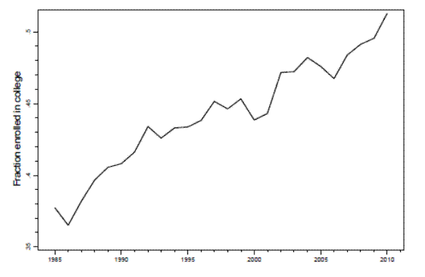 Figure 4 provides an introductory overview of these arguments. It has been noted that the fraction of teens in the CPS who report being enrolled in school during summer months has been rising dramatically since the mid-1990s (Morisi 2010), which mirrors the downward trend in employment. Indeed, figure 4A shows that by July 2010, nearly half of 16 and 17 year olds report being enrolled in July. The blue line displays the fraction who report being enrolled in June, July, and August (using matched monthly CPS microdata); roughly one-third of teens now report being enrolled in school over the summer months. This may be due to increased attendance at formal summer school or informal academic and extracurricular camps, perhaps in order to appear more attractive to colleges; indeed, college enrollment rates (as calculated from CPS microdata) have continually risen over this period (figure 4B).