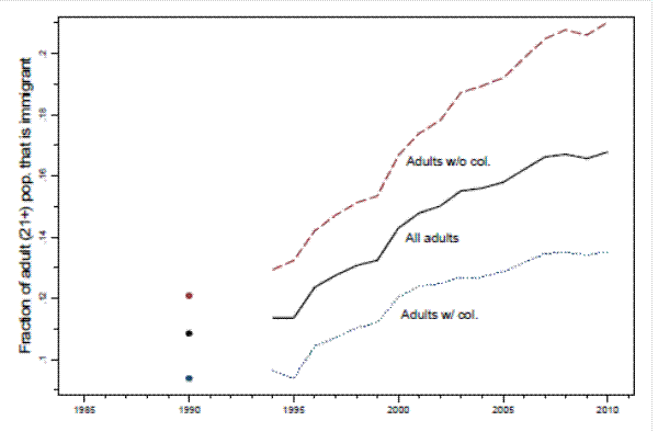 In table 9, I take concerns about the endogeneity of immigrant concentrations more seriously. The share variable in the regressions presented in this table is estimated only for native adults, and is estimated from Census data for 1980, 1990, and 2000, and American Community Survey data for 2009. These regressions are differenced versions of those presented in earlier tables, with similar controls, except that state fixed effects are not included (because the results are differenced). The share of the non-college population that is immigrant also enters as a separate variable. I use a differenced equation because, as discussed in Smith (2012), the IV strategy as defined below predicts changes in immigrant concentrations.