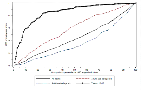 As explained in section 1, the occupational distribution of the U.S. adult labor market has "polarized," with relative wages and employment growing for the highest and lowest paying occupations. The prevailing explanation is that declining costs of computerization and automation have reduced labor demand for jobs that specialize in routinized tasks (such as clerical and manufacturing labor, which were historically middle-paying, "middle-skill" jobs), increased labor demand for jobs that are made more productive by this technology (jobs that require abstract, creative, design-based tasks, i.e. jobs requiring more education), and have had little direct effect on labor demand for jobs that require manual tasks (which are not routine and not easily automated, i.e. service sector jobs). One implication of the decline in labor demand for middle-skill jobs is that the people who were in these occupations, or future workers who would have been in them eventually, may be displaced to lower-skill, lower-paying service sector jobs. As argued in section 1, these jobs are the ones most commonly held by teens.