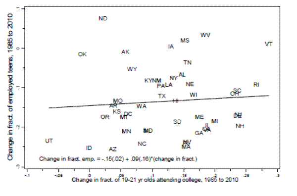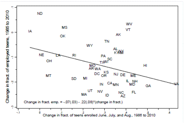 One interpretation of these findings is that the decline in teen employment has potentially troubling long-term consequences, since a significant fraction of it appears due to shifts in labor demand. Nevertheless, it appears that teens are substituting more formal forms of human capital (i.e. summer school and college prep) for work experience, which may mitigate some of the negative effects. This is especially true if teens were previously spending inefficiently low amounts of time on academics. Although analyses of time use data, like the one presented here, start to fill in our knowledge about what non-employed teens are doing with their extra time, bringing additional data to bear on the question, with longer sample periods and larger samples, will be valuable for describing what non-employed teens are doing with their time, how time use has changed over the years, and ultimately what the long-run ramifications may be. At the moment, we do not know enough about the returns to working while in high school (relative to the returns to alternative time uses) to make definite conclusions about welfare costs; future research might address this question by using the supply and demand shifters presented in this paper to explore how youth non-employment affects later life outcomes. At a minimum, these results are strongly suggestive that the on-going decline in teen employment is at least not entirely due to a shift in labor supply.