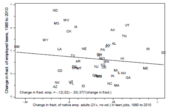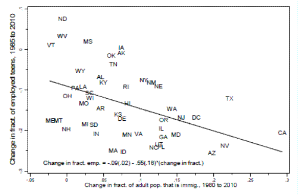 In column 1, teen employment rates (the dependent variable) are estimated from CPS data. The share of native adults in teen jobs is negatively associated with teen employment, although not significantly so. In column 2, I instrument for immigrant shares using two instruments. One is based on the idea that immigrants of a certain ethnicity tend to settle in areas where that ethnicity has settled in the past, regardless of current labor market conditions. The second is based on a state's distance to Mexico, interacted with national trends in the immigration of Mexicans, since Mexican immigrants tend to settle closer to the border, regardless of current labor market conditions. Further detail on the construction of these instruments is provided in Smith (2012).30