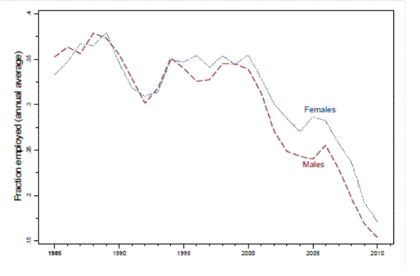 2. Implications of declining youth employmentBefore delving deeper, it is worthwhile to consider why we should be concerned about lower teen employment rates. First, from a welfare perspective it is possible that work experience while school-aged has important benefits later in life, related to learning good work ethic, the importance of punctuality, the ability to deal with bosses and co-workers, and so on. However, the literature on the returns to working as a teenager on later life outcomes is surprisingly meager.3 The primary papers on the subject all use data from the National Longitudinal Survey of Youth 1979 to estimate the relationship between employment while in high school and later life labor market outcomes, controlling for the wide range of covariates made possible by the comprehensive nature of the NLSY. Ruhm (1997) finds positive effects of high school employment on earnings 5-10 years later, and Light (2001) finds that the returns to high school education are somewhat smaller after controlling for high school work experience (suggesting that work experience has positive effects on future earnings). More recently, Hotz et. al. (2002) argues that, after controlling for dynamic selection, work experience in high school has no effect, or possibly even a slightly negative effect, on future earnings. Although suggestive, these papers may have limited implications for recent declines in teen employment since the mid-1990s since they are derived from much older cohorts.