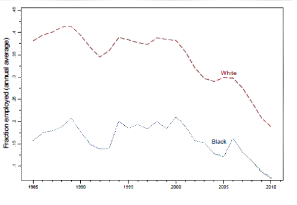 Looking at annual averages masks significant distinctions between summer and non-summer months. During school year months (figure 11), there is essentially a perfect inverse relationship between the fraction in school and the fraction employed and in school, suggesting that the decline in school year employment is coming almost entirely from a drop in the number of part-time working students. During summer months (figure 12), the story is different: summer employment rates have fallen evidently because the fraction only employed has fallen (the fraction in school and working actually increased over the 1990s and has since flattened out). The fraction in school only shows a surprising increase over much of the entire sample period, which I explore more carefully in the next section. Columns 9-16 of table 1 provide these statistics by demographic characteristics. During both the summer and school year months, the fraction idle is higher for blacks and for teens with less-educated parents, although the trends in all of these categories are fairly similar across all groups.