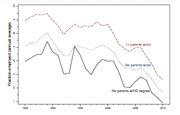 In summary, the literature provides inconclusive evidence on the degree to which employment while in high school is beneficial for human capital accumulation and future earnings, and therefore the welfare implications are similarly inconclusive. If teens are not working because of greater focus on graduating high school or improving their odds of college enrollment, then they may be substituting more formal forms of human capital acquisition for early work experience; given the wide college wage premium, this may have positive welfare consequences for college-bound teens. If instead teens are not working because adults are encroaching on their labor market, increasing competition in the lower-skill labor market and lowering wages (subject to the lower bound of the minimum wage), then this may be more detrimental (especially for non-college bound teens).5 Of course, increased competition in the lower-skill adult labor market may also encourage high school and college graduation by raising the returns to education, so over a longer period, a decline in demand for teen labor due to crowd-out may be indirectly associated with a shift in supply.
