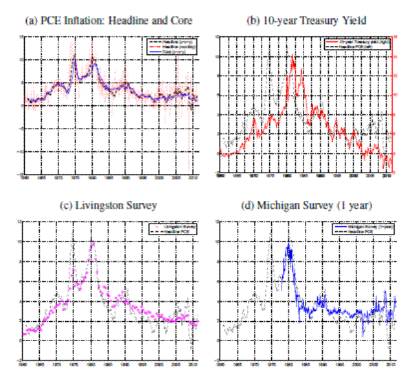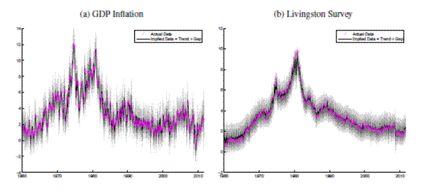 As shown in Figure 2, trend estimates based on surveys and inflation broadly track the "Great Inflation" of the 1970s and the subsequent disinflation under Federal Reserve Chairman Pal Volcker during the first half of the 1980s. Starting at about 1% in the