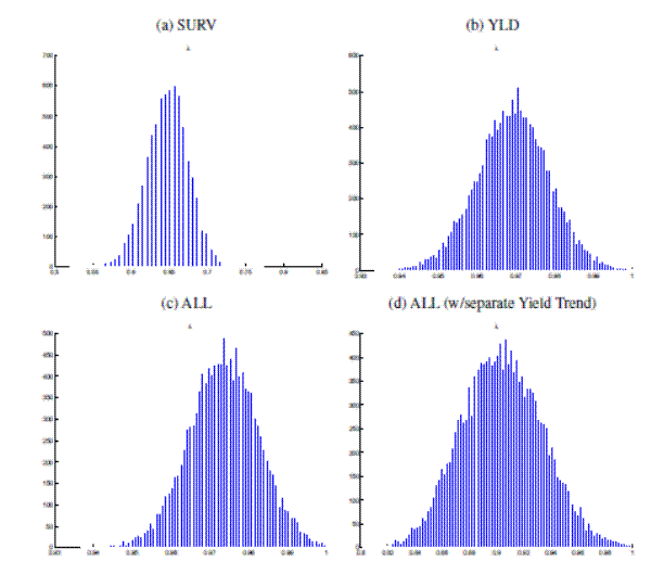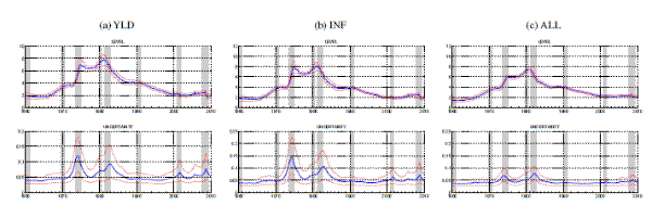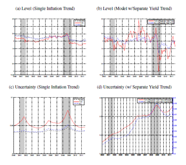 Panel (b) of Figure 6 displays estimates of level and uncertainty of trend inflation estimated from YLD and ALL, while allowing for a separate yield trend, as described in Section 5.2. Both measures are more volatile than those derived from the model with a single, common trend in inflation and yields; and both dropped more vigorously in late 2008 than the single-trend estimates shown in Panel (a). However there is considerable uncertainty attending these estimates, in particular in the case of the YLD two-trend model whose estimates appear excessively volatile. Still, the posterior distributions of both estimates (not shown in the figure) place more than 90% of their mass on trend values below 2%, but not significantly below