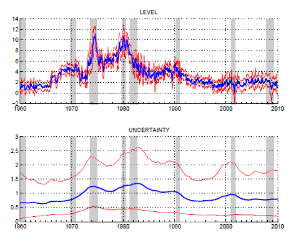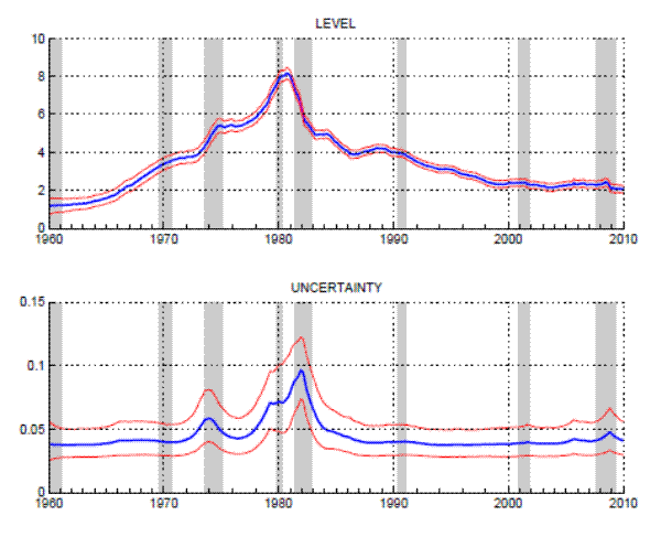 The volatility of trend shocks -- labeled "uncertainty" in the lower panel of Figure 2 -- is measured by the standard deviation of a monthly trend shock, where the trend itself is expressed in units of annualized inflation rates. During "normal" times, like the 1960s or the Great Moderation period (1980s to 2007), the estimates of uncertainty typically stand at values close to 4 basis points. A monthly standard deviation of this size cumulates to a standard deviation of about 15 and 40 basis points over periods of one and ten years respectively-provided that the uncertainty of trend shocks remains at 4 basis points per month.21
