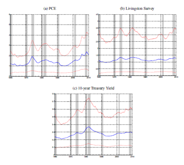 Note: The top panel shows the smoothed estimates of the trend and the bottom panel shows uncertainty about trend shocks. These estimates are derived from the extended model described in Section 7, allowing for time-varying gap dynamics, stochastic volatility in gap innovations, using data on headline PCE, core PCE, the seasonally adjusted CPI as well as the Livingston survey -- the conditioning set called "TVP1" in Table 2. Red-dashed lines show 90% confidence intervals based on the model's posterior distribution conditional on all data. NBER recession dates are shaded.Figures 14 and Figures 15 report estimates of the stochastic volatility series for the gap variables in the time-varying parameter models (Section 7) for models TVP1 and TVP2 respectively.