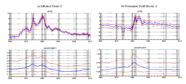 by 2000. However, the persistently elevated level of long-term interest rates during the early 1980s is reflected in a somewhat slower decline in the YLD trend during the 1980s. These differences between the two trend estimates are consistent with the prolonged skepticisms of financial markets concerning the durability of the disinflation efforts of the Federal Reserve in the early 1980s, which led Goodfriend and King (2005) to refer to this episode as the "incredible Volcker disinflation." Notably, the YLD trend records also a marked peak in 1974/75, coinciding with the burst in inflation rates discussed at the end of the previous section. Estimates of trend and uncertainty based on the combined data of SURV and YLD, that is all variables listed in Table 1, are very similar to the YLD estimates (shown in Appendix C).