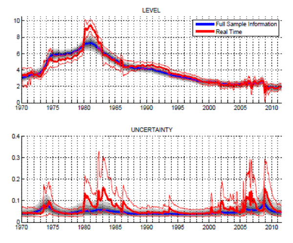 Another critical period occurred during the late 1970s, before the onset of the Volcker disinflation. In real-time, the trend estimates reacted more dramatically to incoming data-- this time overshooting the smoothed estimates by almost 2 percentage points over the course of 1979-82.26 Both measures pick up marked increases in trend inflation between 1973 and 1975. However, for most of the 1970s, the real-time estimates are about 50 basis points lower than the smoothed trend measure, rendering the increase of the real-time trend in early 1980 even more pronounced. Strikingly, during the recent crisis the real-time measure of uncertainty reached about the same heights as during the early Volcker years and well into 1983/84, a period which Goodfriend (1993) also characterized as an inflation scare. Interestingly, the inflation scare of 1994 registers clearly in real-time estimates of trend and uncertainty. Since the bond market turmoil of 1994 proved short-lived, it barely shows up in the smoothed estimates.